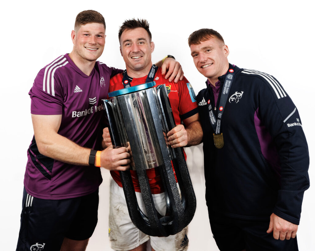 Jack O’Donoghue, Niall Scannell and Rory Scannell with the URC trophy in 2023.