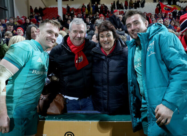 Rory Scannell and Niall Scannell with their parents Bill and Emer after the win away to Gloucester in 2019.