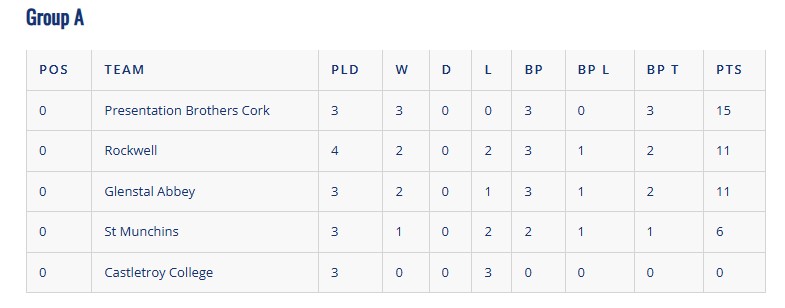 This year sees Presentation Brothers College, Rockwell College, Glenstal Abbey, St. Munchins College and Castletroy College occupy Group A.