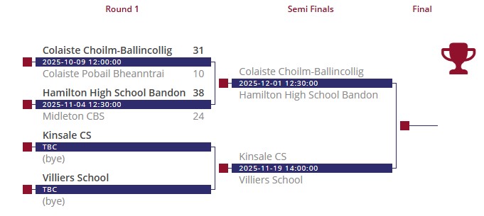 The second round one game saw Hamilton High School Bandon defeat Midleton CBS 38-24 in Bandon.