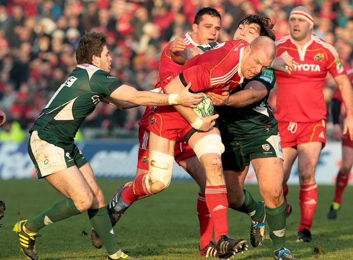 Munster’s Paul O’Connell with Darren Allison and Alex Corbisiero of London Irish